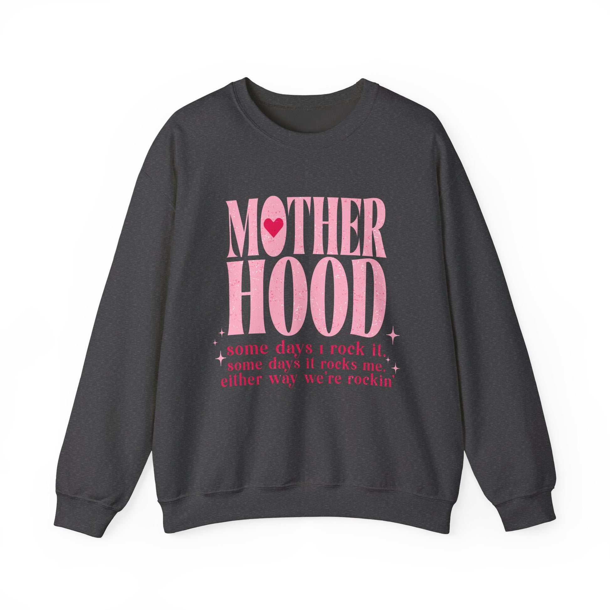 Rock motherhood in comfort and style with this cozy sweatshirt featuring a bold retro pink “Motherhood” design and the relatable quote: “Some days I rock it, some days it rocks me. Either way, we’re rockin’.”