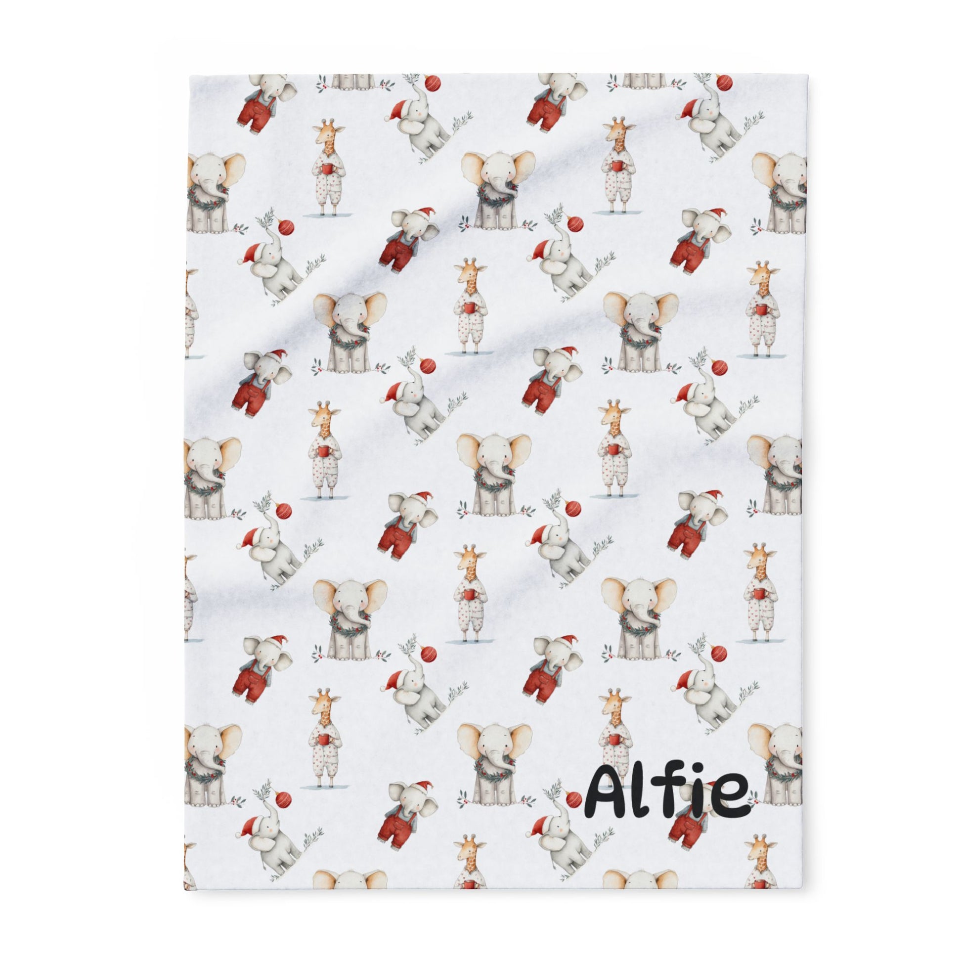 Keep your little one warm and cosy with our Personalised Fleece Blanket (40x30 inch) – soft, snuggly, and designed just for them! Featuring an adorable festive animal print with elephants, giraffes, and reindeer, this custom blanket adds a touch of warmth and personality to any child’s room.